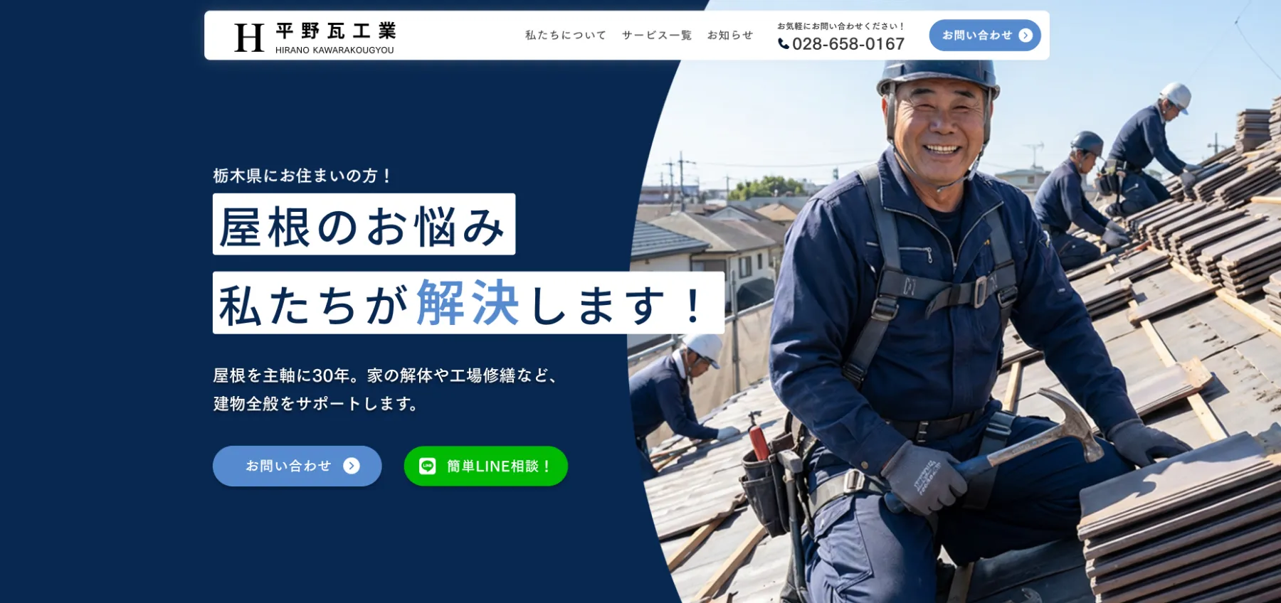 今回のサイト開設にあたり、私たちが大切にしたのは「住まいのお悩み解決のパートナー」としての役割です。 創業以来、屋根の専門家として培ってきた確かな技術力を主軸としつつ、現在は住宅・店舗・倉庫のリフォームや解体など、建物全般に関するご相談を幅広く承っております。